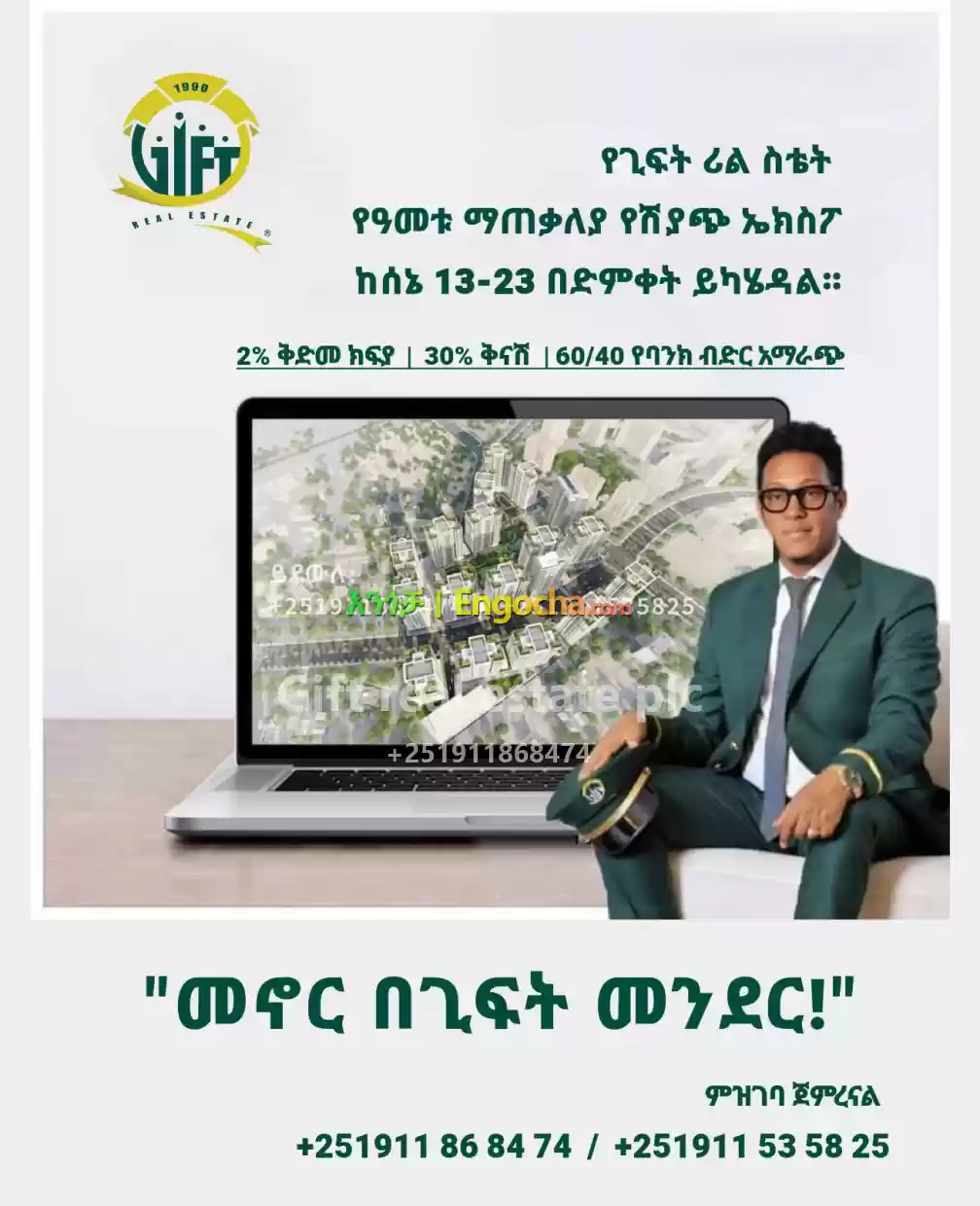 የጊፍት ሪል ስቴት የዓመቱ ማጠቃለያ የሽያጭ ኤክስፖ በለገሃር አራተኛው መንደራችን ከሰኔ 13-23/2017 ዓ.ም. በድምቀት ይካሄዳል፡፡
