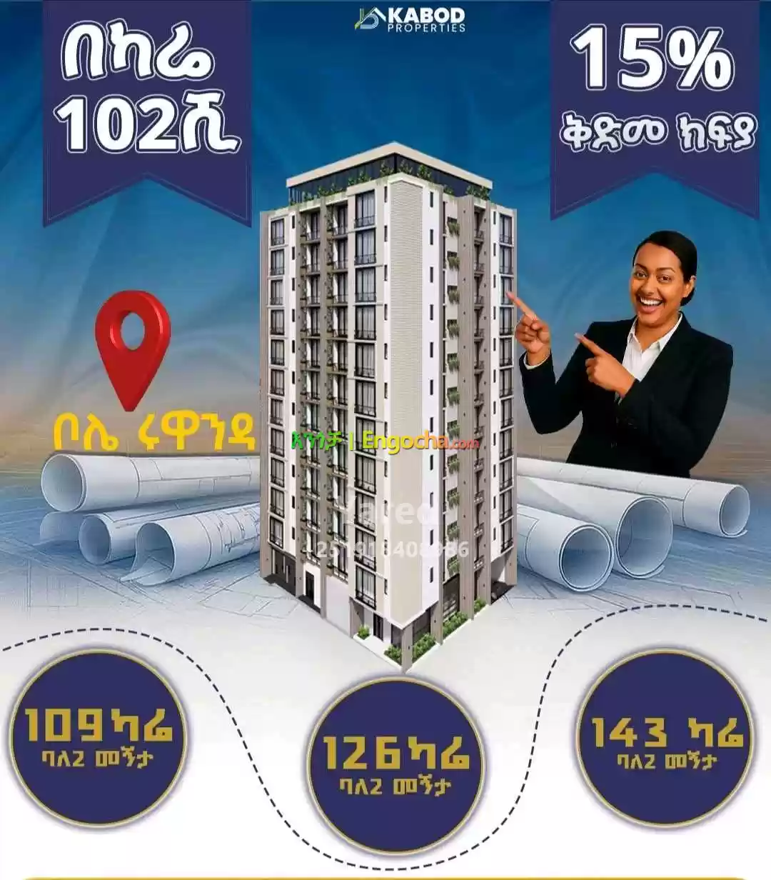 ቦሌ ሩዋንዳ( ሶማሊ ኢምባሲ አጠገብ) G+11+ሰገነት ባለ 2 መኝታ (109 እና 126ካሬ) ባለ 3 መኝታ (143 ካሬ) 102,000 በካሬ ( for sale & price in Ethiopia