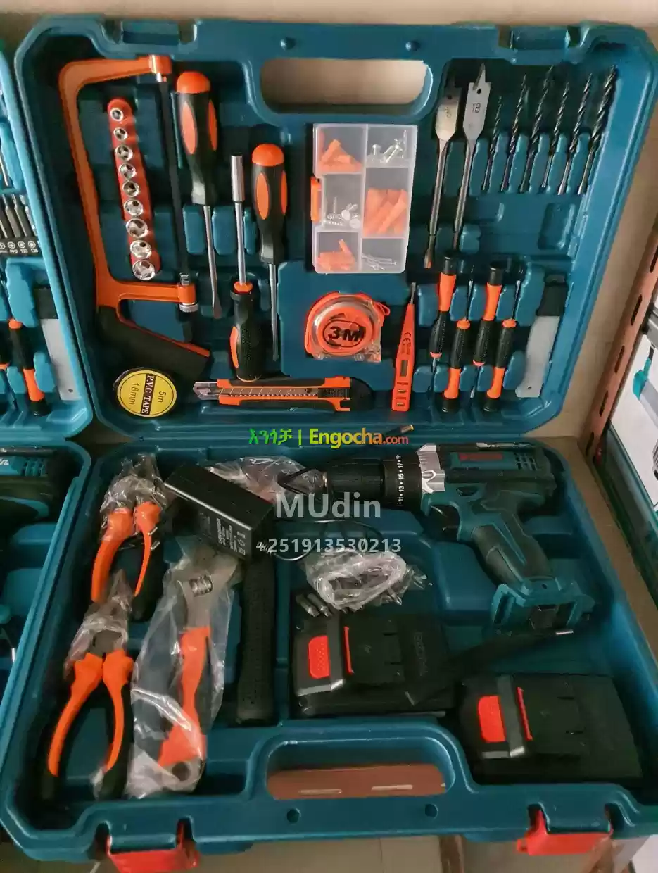 2ባትሪ ያለው ሙሉ አክስሰሪ መዶሻ ሜትር መጋዝ እና የተለያዩ አይነት መፈቻዎች አሉት ይዘዙን ያሉበት እንልካለን ዴልቨሪ አለው